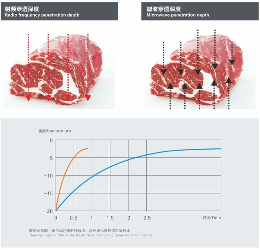 - 在冻品解冻时,由于射频的穿透能力强,电磁场可以穿透整箱冻品,使其内外同时升温解冻,整个过程极少失水,保持冻品(尤其肉类)原有的生鲜品色;